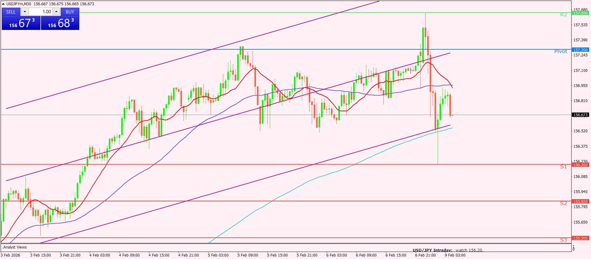 فتح صفقات بيع دون 157.30، مع استهداف 156.20 وامتداد الحركة نحو 155.85.