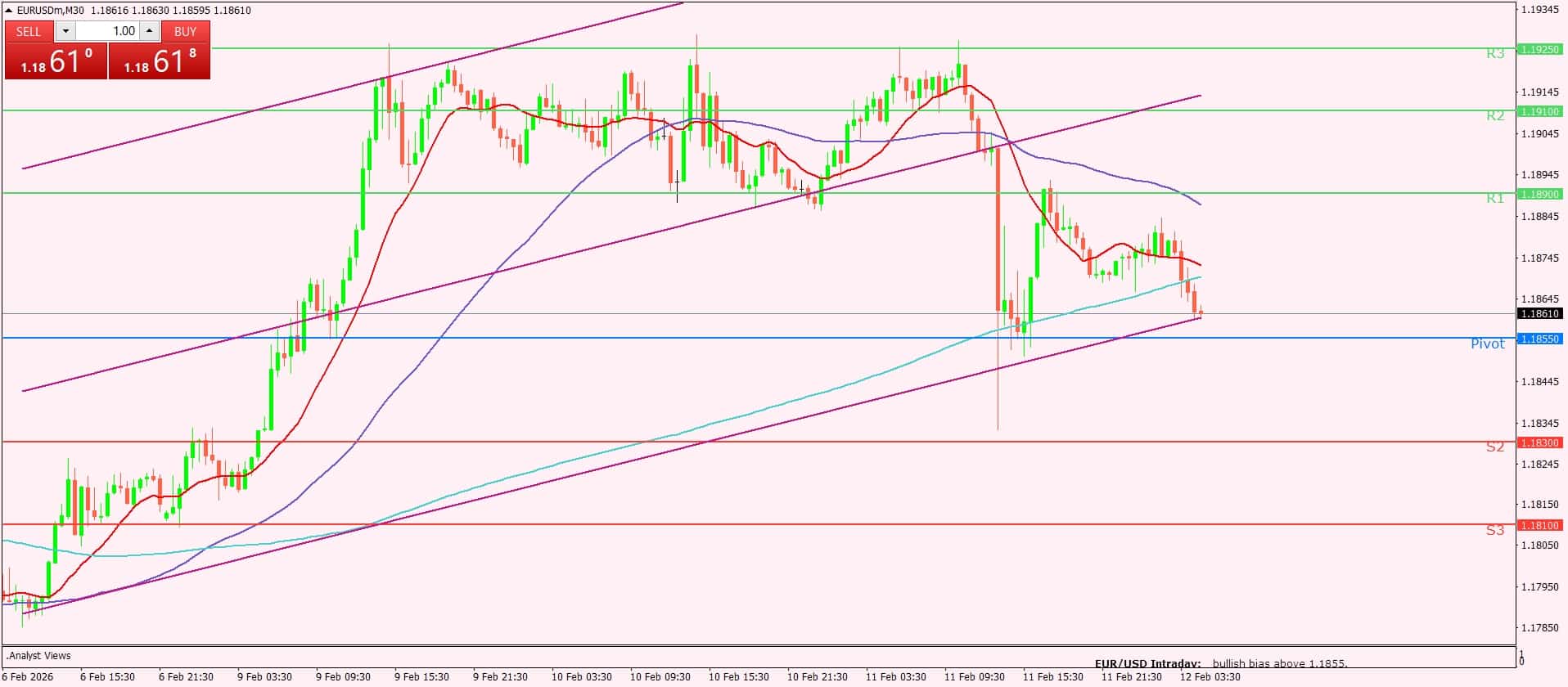 في حال الهبوط دون مستوى 1.1855، يُتوقع امتداد التراجع نحو 1.1830 ثم 1.1810 كمستويات دعم تالية.