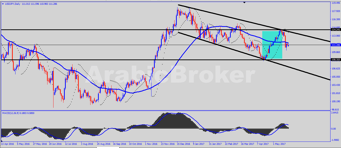المضارب العربى / استمر زوج الدولار مقابل الين بالميل الهابط  على فريم اليومى كما نلاحظ تحرك السعر داخل نموذج القناه الهابط  ليقترب الآن من مستوى مقاومة  دعم القناة الرئيسية الهابطة حول 108,50 ومستويى 109,30 ، حيث يظهر تأثير إيجابية مؤشر الماكد  الذي يدفع بالسعر هبوطا .