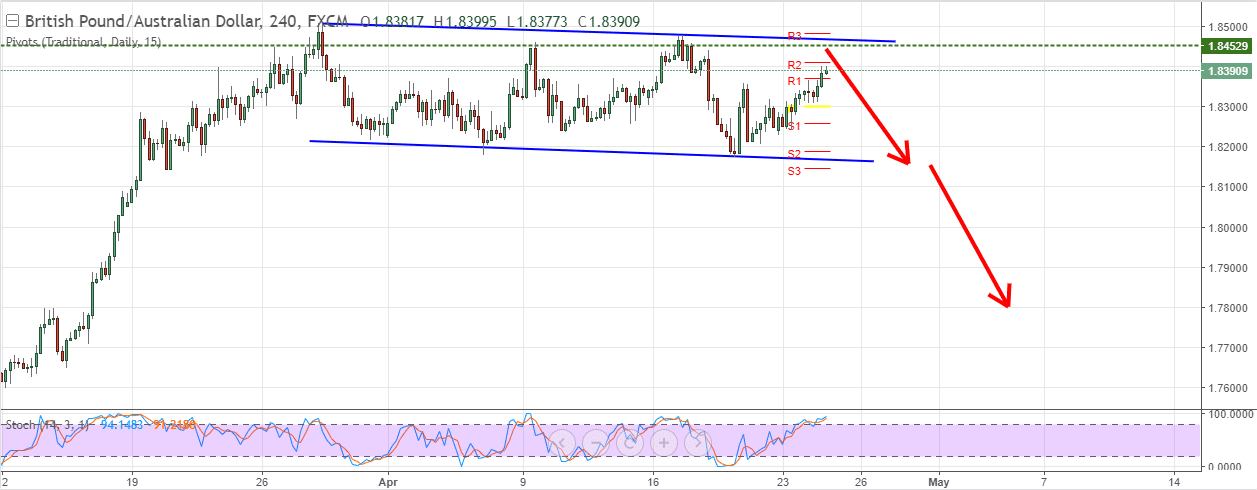 علي الاطار الزمني الأربع ساعات, بلغ زوج العملات الاسترليني استرالي أعلي مستوياته عند 1.8450 حيث فشل في اختراقها لثلاث مرات علي التوالي مكونا ثلاث قم. السعر استمر في التذبذب في نطاق عرضي مكونا النموذج الفني الانعكاسي المستطيل. نتوقع هبوط السعر نحو الحد السفلي لنموذج المستطيل.