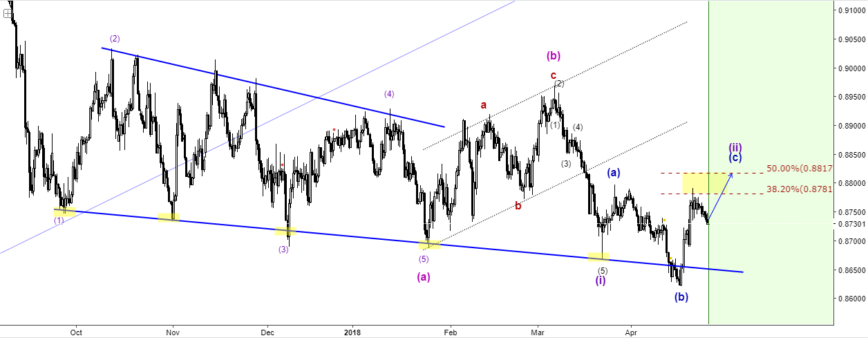حسب الترقيم الموجي لاليوت الموضح علي الشارت, يتحرك زوج العملات اليورو استرليني في حركة تصحيحية عبارة علي الموجة التصحيحية الثلاثية abc. السعر أنهي الموجتين a و b وهو حاليا في الموجة c حيث بلغ الموجة الثانية الداخلية التصحيحية منها. السعر لازل من المتوقع أن يستمر في الهبوط في اطار الموجة c. ننصح بالتالي بالبيع مع كسر لأول دعم.
