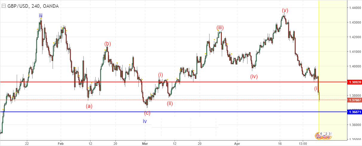 يتحرك زوج العملات الاسترليني دولار في نطاق عرضي حيث اقترب مرة أخري من بلوغ الحد السفلي الدعم 1.3720. حسب الترقيم الموجي الموضح علي الشارت, السعر أنهي موجة دافعة خماسية صاعدة وبدأ في الهبوط لتكونن التصحيح ABC. نتوقع بالتالي كسر الحد السفلي للنطاق العرضي.