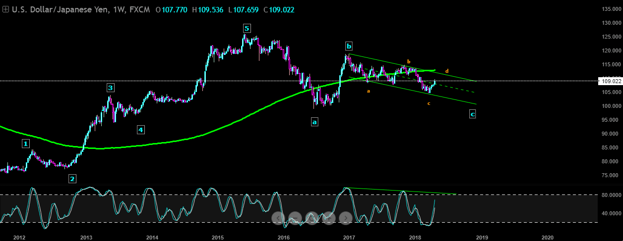 علي الاطار الزمني الأسبوعي, يسير زوج العملات الدولار يان داخل قناة هابطة. حسب الترقيم الموجي الموضح علي الشارت, السعر في موجة تصحيحية C من التصحيح abc بعد أنهي موجة صاعدة خماسية سابقة. نتوقع استمرار الهبوط الضعيف في اطار الموجة c خلال الأشهر القادمة.