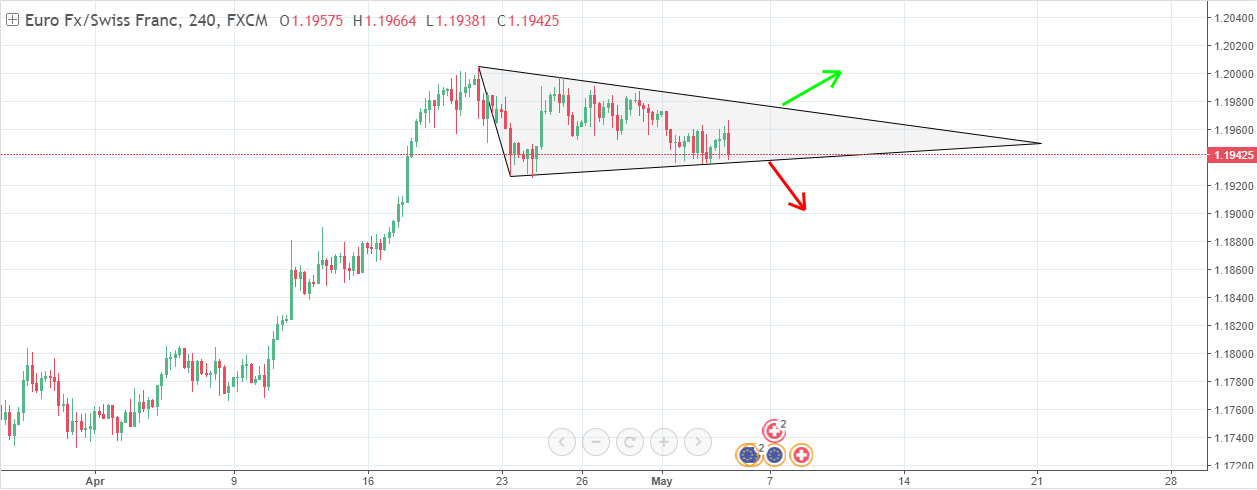 صعد زوج العملات اليورو فرنك أكثر من 250 نقطة الشهر الماضي وهو رقم يعتبر كبير مقارنة بالحركة المعتادة للزوج. السعر دخل بعد ذلك في حركة تصحيحية عرضية أدت الي تكوين النموذج الفني المثلث المتماثل. من الممكن أن ينتهي التصحيح في كلا الاتجهاين لذلك البيع والشراء وارد.