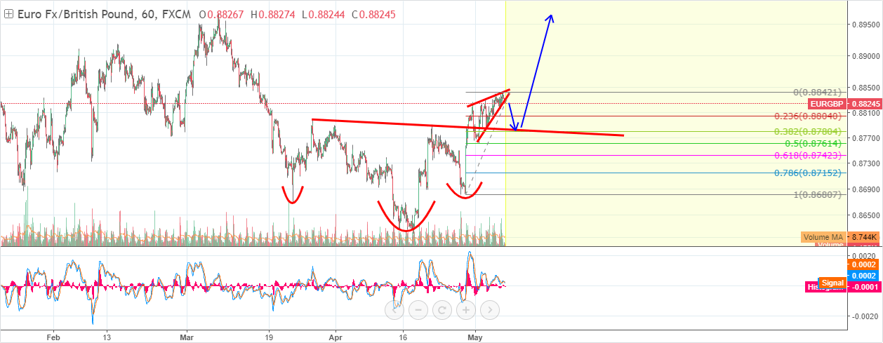 علي الاطار الزمني الساعة, قام زوج العملات اليورو استرليني باختراق النموذج الفني الانعكاسي الرأس والكتفين بموجة صاعدة نتوقع أن لا تستمر وبعود الزوج لاختبار المقاومة المخترقة. نوصي بالشراء من مستوي 0.8785 بهدف نموذج الرأس والكتفين المقلوب كما هو موضح علي الرسم البياني.