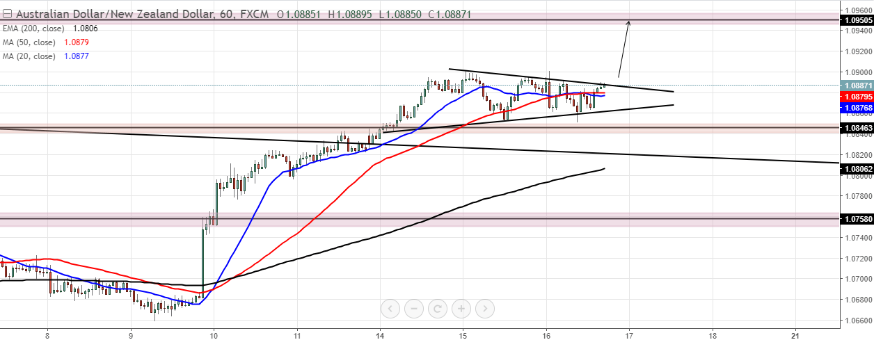 علي فريم الساعة, قام زوج العملات الاسترلي نيوزلندي بتكوين النموذج الفني المثلث التماثل اثر اتجاه صاعد أو ما يعرف بنموذج العلم. النموذج استمراري بالأساس لذلك نتوقع الاختراق لأعلي ونوصي بالشراء. ما يدعم الصعود هي تتداول السعر أعلي المتوسطين المتحركين 20 و50.