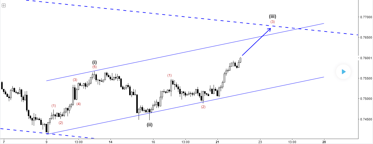 علي الاطار الزمني الساعتين, شرع زوج العملات الاسترالي دولار في الصعود في موجة دافعة صاعدة حيث قام بتكوين الموجة الأولي والثانية الداخليتان من الموجة الأم. نتوق بالتالي استمرار الصعود في الموجة الثالثة الداخلية ونقترح الشراء مع اختراق لأي مقاومة.