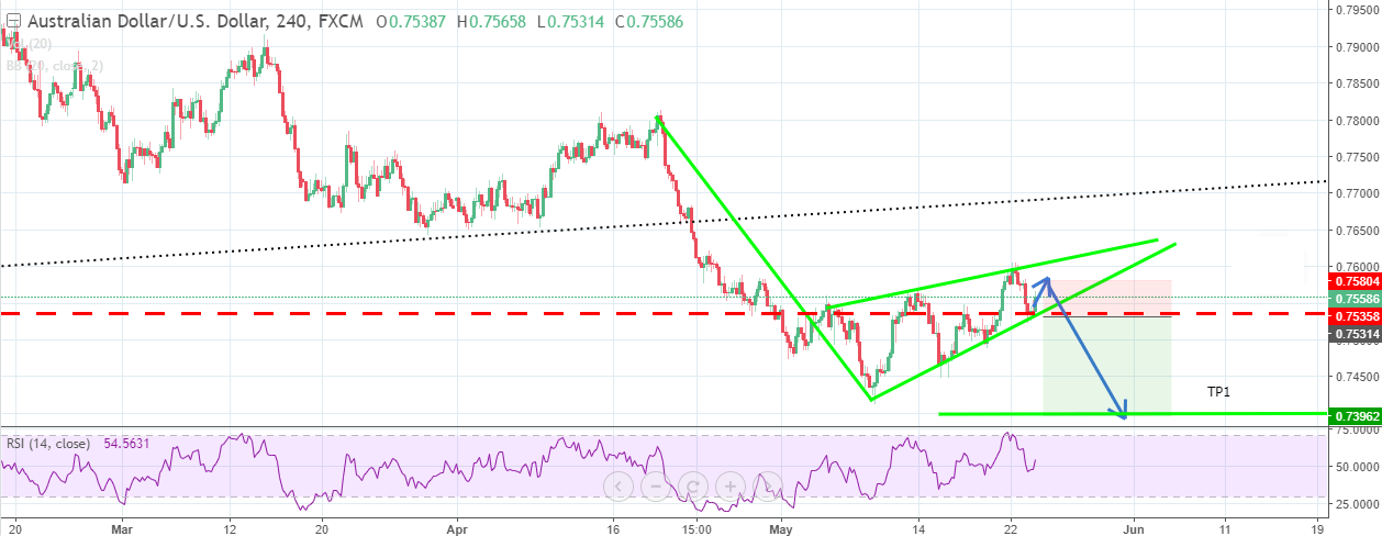 علي فريم الأربع ساعات, قام زوج العملات بتصحيح صاعد علي شكل نموذج الوتد اثر موجة هابطة ما أدي التكوين النموذج الفني الاستمراري العلم الهابط. فرصة للبيع نقترحها بناءا علي النموذج بستوب لوز وتايك بروفيت موضحين علي الشارت. نوصي بالبيع مع كسر الحد السفلي للنموذج.