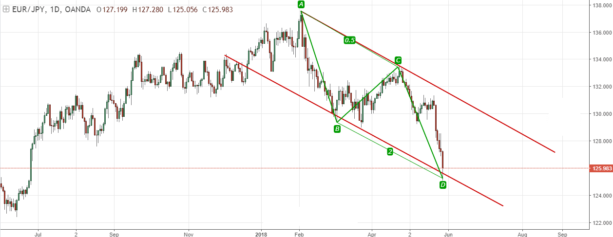 أثرت الاضطرابات السياسية في إيطاليا وإسبانيا بالسلب علي اليورو في حين سجل ين الملاذ الآمن مكاسب واسعة وسط النفور من المخاطرة على نطاق واسع الأمر الذي أدي الي انهيار زوج اليورو يان وانهائه لنموذج الهارمونيك الشرائي ab=cd. نتوقع الانعكاس والتصحيح من المستوي الحالي.