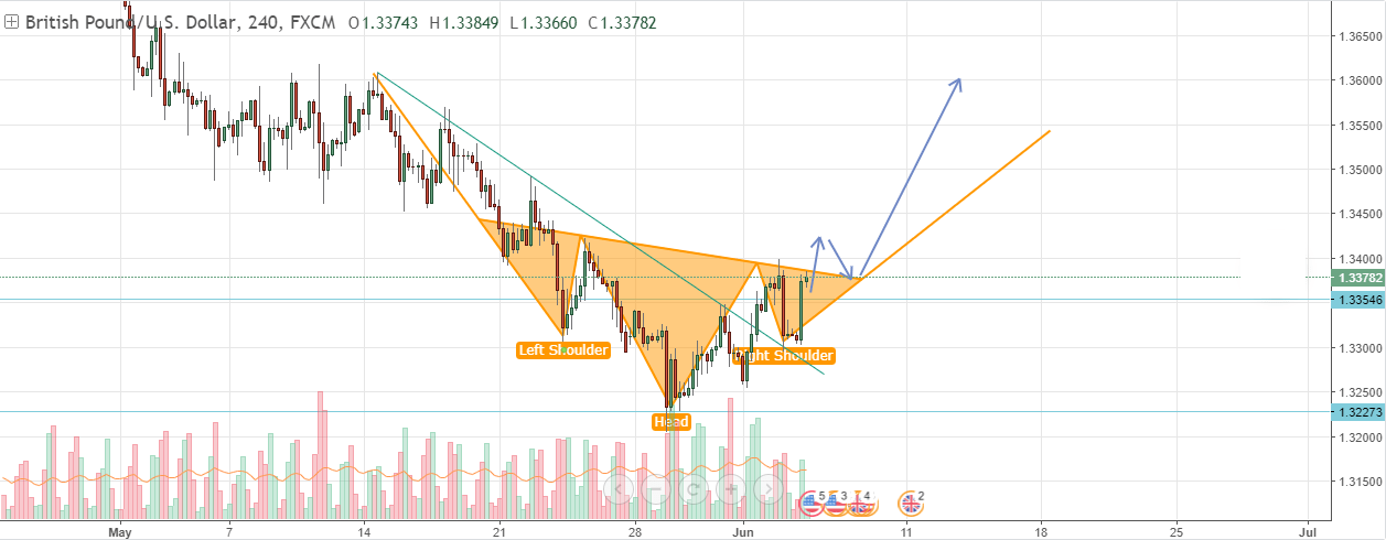 ارتفع الجنيه الاسترليني إلى أعلى مستوياته خلال اليوم في يوم الثلاثاء، حيث قفز نصف نقطة مئوية مقابل الدولار بعد أن أظهرت بيانات أن قطاع الخدمات في المملكة المتحدة قد نما بوتيرة أسرع من المتوقع في مايو. علي فريم الاربع ساعات, السعر كون نموذج الرأس والكتفين المقلوب. نتوقع الهبوط مع اختراق الحد العلوي للنموذج.