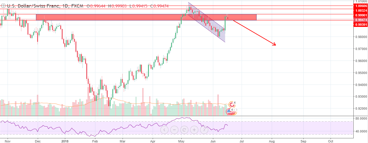 رغم انخفاض الدولار امريكي أمام بقية العملات بسبب تصاعد خطر حرب تجارية عالمية بين الصين وأمريكا اثر قرار الولايات المتحدة يوم الجمعة بفرض رسوم على سلع صينية بقيمة 50 مليار. الا أن الدولار ارتقع أمام الفرتك السويسري واخترق نموذج العلم الصاعد علي فريم اليومي. نتوقع صعود الزوج خلال الساعات القادمة.