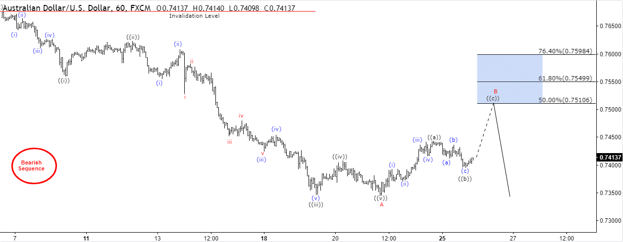 انخفض الدولار الأسترالي لأدنى مستوى في عام عند 0.7394 دولار أمريكي الأسبوع الماضي، متأثرا بالنزاع التجاري بين الصين والولايات المتحدة. موجيا, علي فريم الساعة, السعر أنهي موجة دافعة هابطة a وشرع في تكوين الموجة التصحيحية b. نتوقع مزيد من الصعود كما هو موضح علي الشارت قبل استئناف الهبوط.