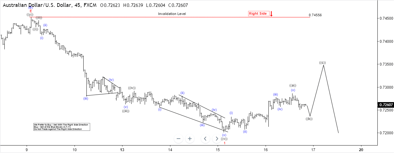 صعد الدولار الاسترالي بعدما تراجع إلى 0.7202 دولار يوم الأربعاء وهو ما كان أدنى مستوى له منذ يناير كانون الثاني 2017. موجيا بعد تكوين موجة أولي دافعة هابطة صعد السعر في الموجة التصحيحية الثانية. نتوقع استمرار الصعود كما هو موضح علي الشارت قبل العودة للهبوط.