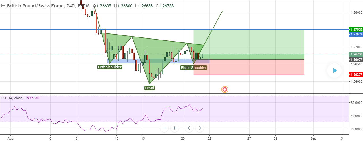 علي الاطار الزمني الأربع ساعات, قام زوج العملات الاسترليني فرنك بتكوين النموذج الفني الانعكاسي الرأس والكتفين المعكوس بعد اتجاه هابط. مع بدأ بناء الزخم الشرائي الموضح علي مؤشر RSI نتوقع حركة قوية لأعلي وننتظر الصعود بناءا علي النموذج الفني. نقترح الشراء بفرصة موضحة علي الشارت.