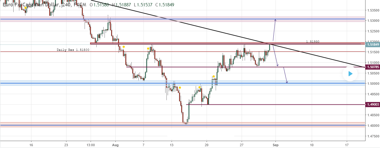 علي فريم الأربع ساعات, يستعد زوج العملات اليورو كندي لاختراق الترند لاين الهابط والمقاومة الهامة 1.5193 والتي تمثل خط العنق لنموذج الرأس والكتفين المعكوس. فرصة قوية للشراء في حال اغلاق شمعة أربع ساعات أعلي النموذج. هدف صفقة الشراء سيكون المقاومة 1.5196.