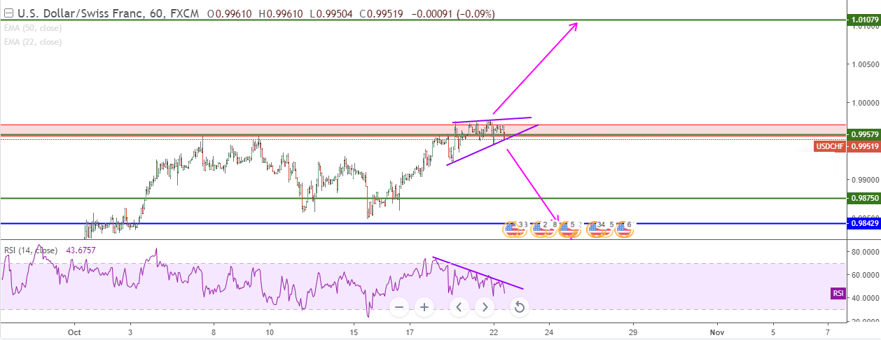 رغم ارتفاع اليورو اليوم بفضل هبوط تكلفة اقتراض الحكومة الإيطالية بعد الارتفاع الأخير لتنعم السوق بشيء من الهدوء. لم نري ارتفاعات علي الفرنك السوسري حيث بقي ضعيفا أمام الدولار أمريكي. السعر يسبر في جركة تصحيحية علي شكل نموذج المثلث المتماثل حول المقاومة الهامة 0.9950. سينارو الصعود هو الأقرب ولو نظرنا الي الزخك علي مؤشر RSI.