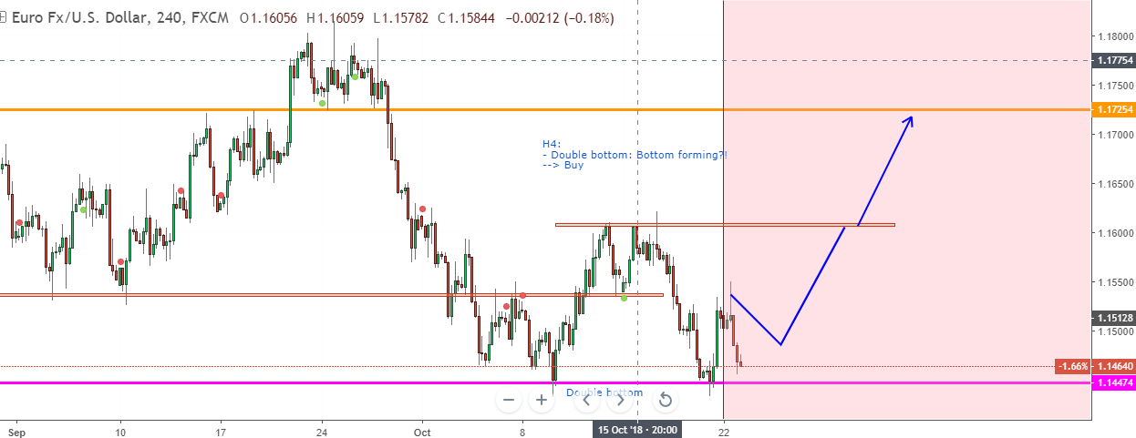 لا يزال المستثمرون يشعرون بالحذر، بسبب الخلاف بين حكومة إيطاليا والاتحاد الأوروبي بشأن مشروع ميزانية روما لعام 2019، والذي رفضته المفوضية الأوروبية باعتباره انتهاكًا لقوانين الاتحاد الأوروبي. فنيا في حال عودة السعر للصعود نتوقع انهاء نموذج القاع المزدوج.
