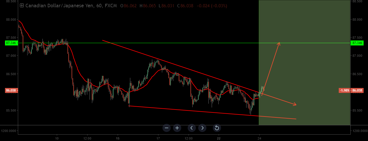 اتجهت الأسواق نحو العزوف عن المخاطرة يوم الثلاثاء ليرتفع الين بسبب الخلاف حول خطط الإنفاق الإيطالية والشكوك التي تحيط بزعامة رئيسة الوزراء البريطانية. منذ ساعات انخفض اليان اليباني أمام الدولار كندي ما أدي الي ارتقاع الزوج واختراقه لنموذج الوتد الهابط. نتوقع استمرار الصعود نحو المقاومة 87.34.