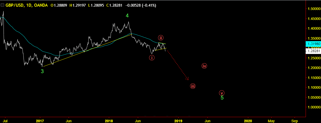 هبط الجنيه الاسترليني إلى أدنى مستوى في سبعة أسابيع أمام الدولار الأمريكي أثناء التعاملات يوم الخميس، مع عودة ظهور المخاوف من أن بريطانيا قد تغادر الاتحاد الأوروبي بدون اتفاق. موجيا علي فريم اليومي, السعر في موجة خامسة دافعة هابطة كما يظهر علي الشارت.