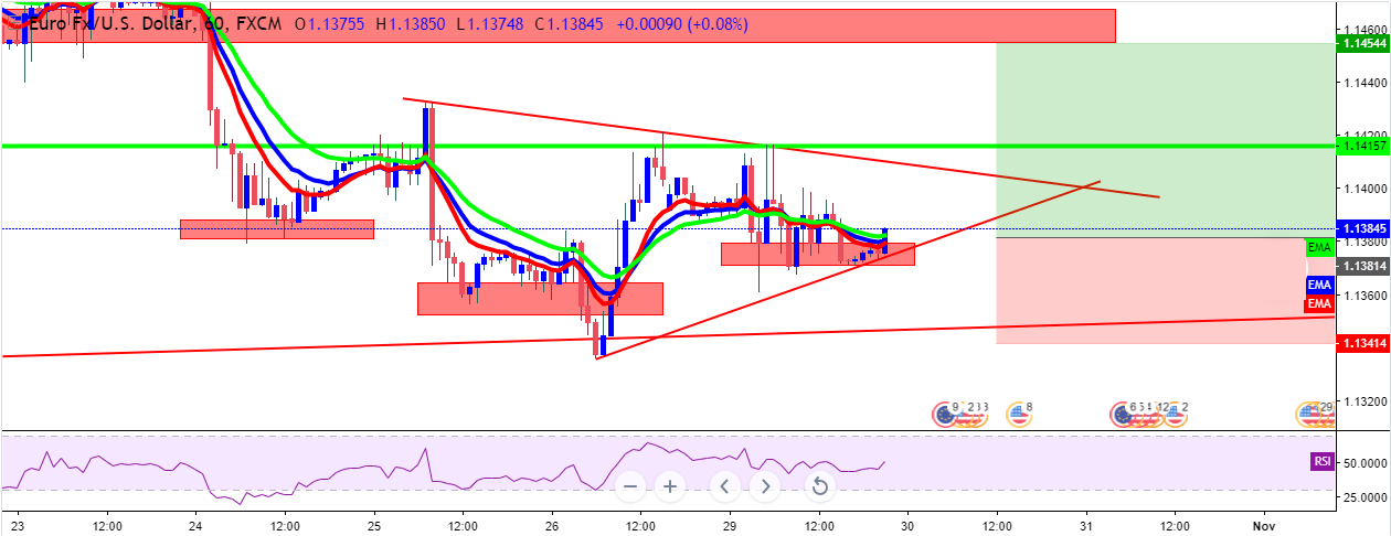 في تداولات يوم أمس, حوم اليورو حول مستوى 1.1350 دولار، وهو أدنى مستوياته في أكثر من شهرين. فنيا, علي فريم الساعة, السعر يتداول في اطار نموذج المثلث المتماثل. نقترح فرصة للشراء لاعادة اختبار منطقة الدعم المكسورة حول مستوي 1.1450.