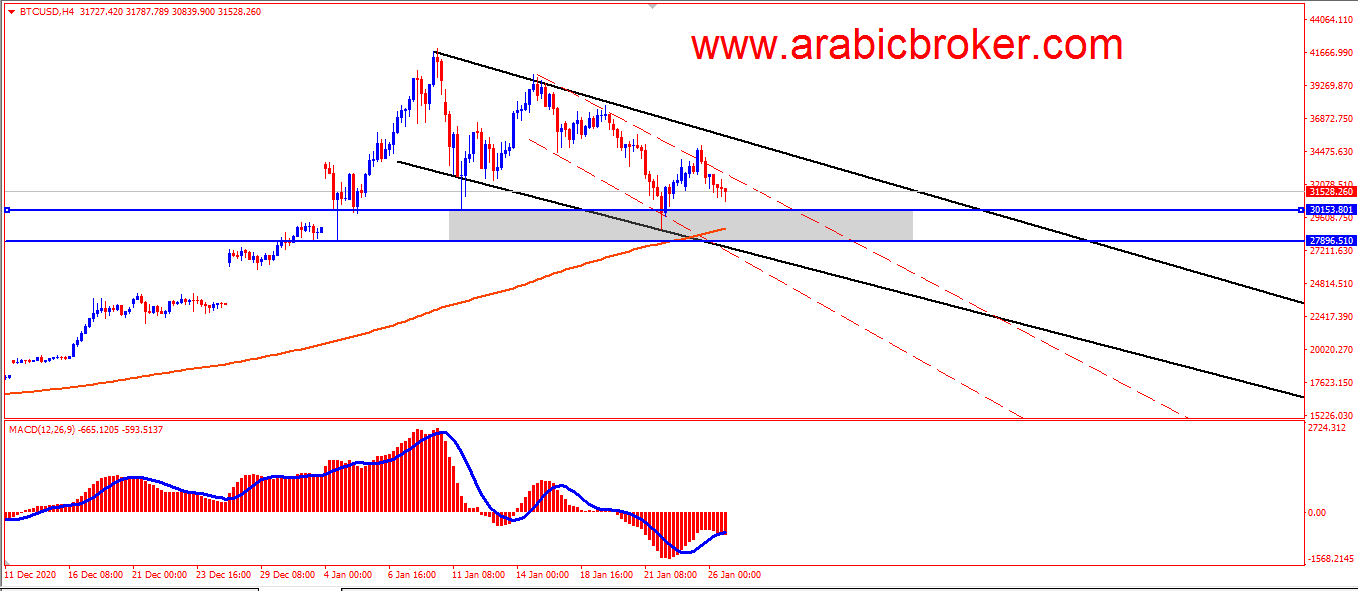 يواصل سعر البتكوين تقديم التداولات السلبية منتظماً داخل القناة الهابطة التي تظهر بالرسم البياني أعلاه، ويقع السعر تحت ضغط ايجابى قادم من المتوسط المتحرك 100، بينما يفقد مؤشر الماكد عزمه الإيجابي بشكل ملحوظ ليصل إلى مناطق التشبع في الشراء.