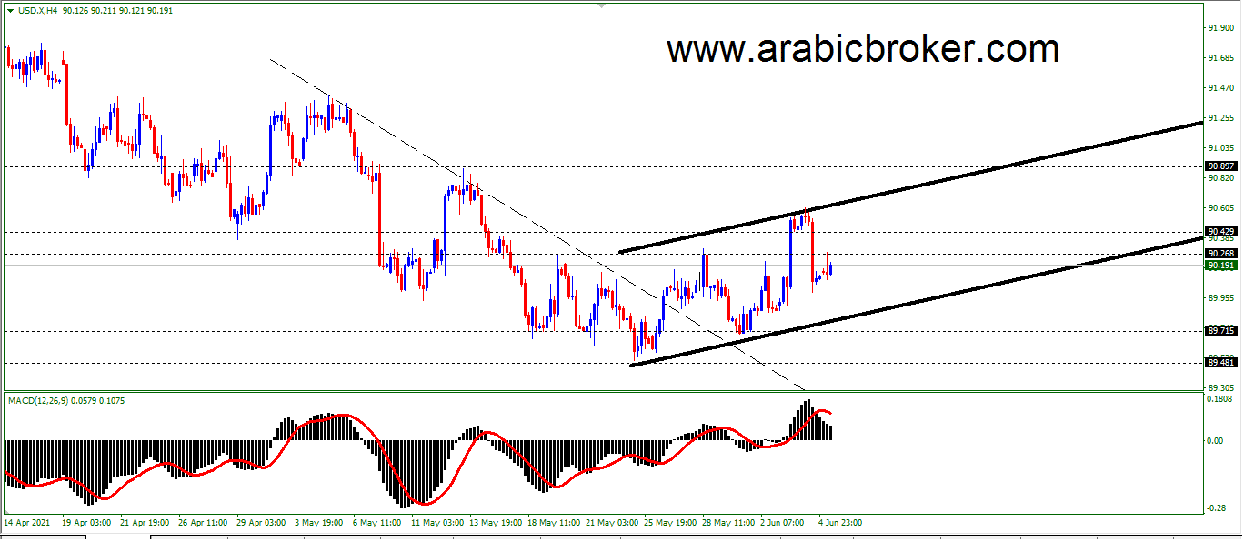 مؤشر الدولار يتحرك بشكل عرضى رغم التداولات الوارده فى تقريرنا الاخير نلاحظ الان استسلم سعر المؤشر لبعض الميل الصاعد لتعارض إيجابية مؤشر الماكد على شارت الاربع ساعات أمام سلبية المتوسط المتحرك 55 والمستقر دون مقاومة القناة الهابطة الممتدة نحو 91.25 لنلاحظ تشكيله مؤخرا لتذبذب جانبي ليستقر بذلك قرب 91.10.