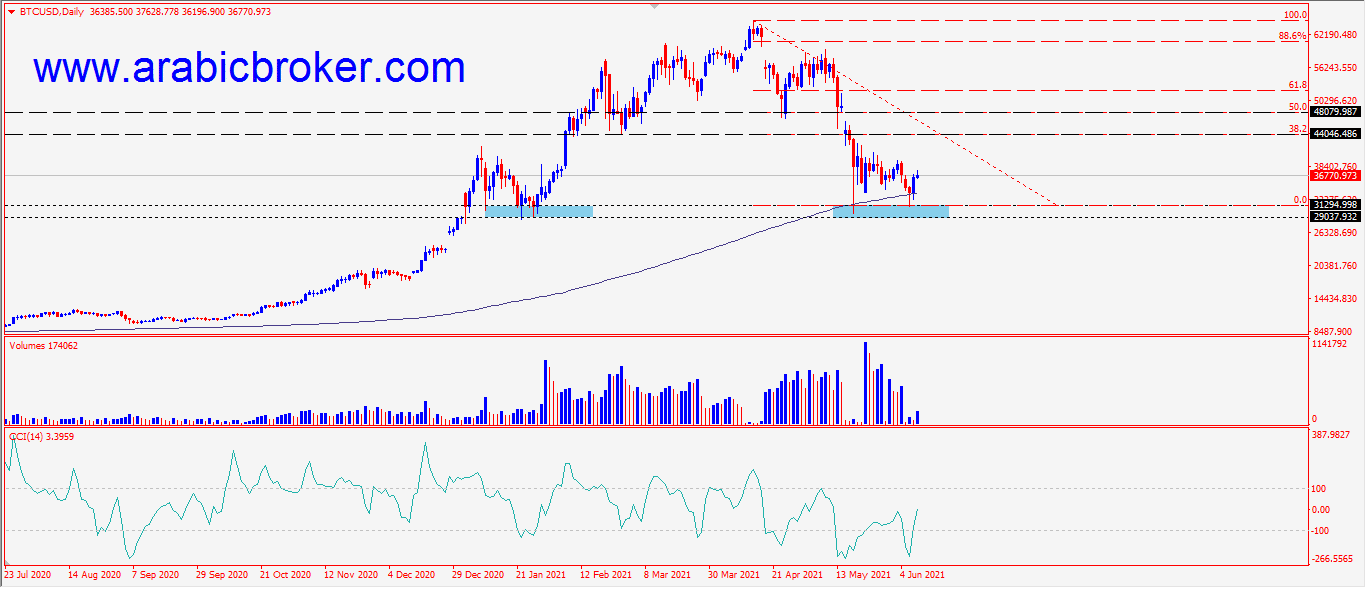 ولهذا تقف توقعاتنا على الحياد انتظاراً لسلوك البتكوين مع مستوى الدعم المحوري 31299