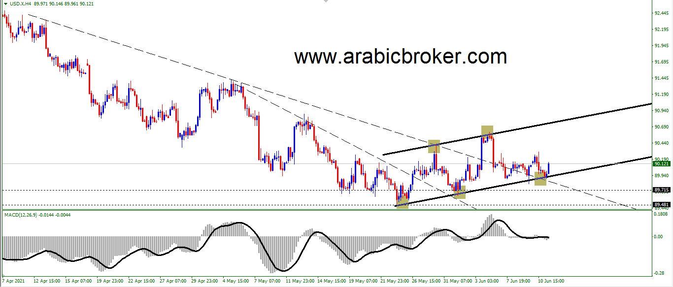 مؤشر الدولار واستقرار الاسعار لا تغيير حتى الان على شارت الاربع ساعات عن مسار سعر المؤشر التصحيحي الصاعد بتذبذبه المتكرر فوق الدعم الهام الأولي المستقر عتد 89.60