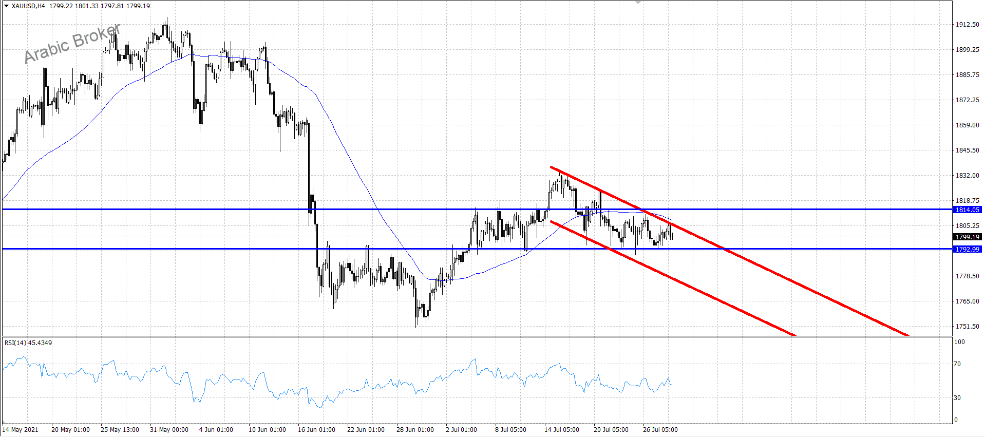 يتداول سعر الذهب بسلبية الآن ليقترب من مستوى 1797.00، بانتظار كسر هذا المستوى لتأكيد امتداد الموجة الهابطة وزيارة مستوى 1770.00 كمحطة رئيسية تالية.