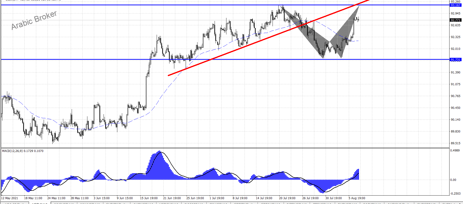 مؤشر الدولار يحاول اختراق مستويات المقاومة من خلا الشارت المرفق اعلاه يظهر مؤشر الدولار الأمريكي تداولات إيجابية واضحة ليهاجم المقاومة الأولى 92.60 ويقترب من المقاومة الأهم عند 93.10،