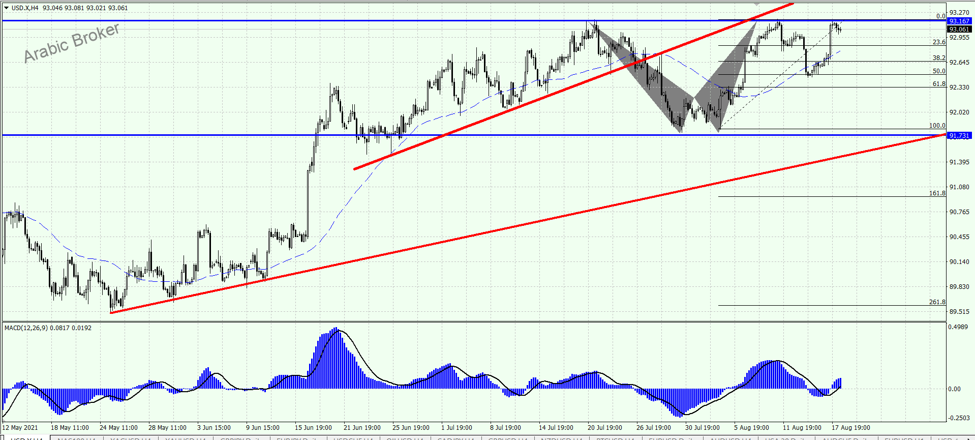 مؤشر الدولار يحوم قرب الحاجز هام كما نلاحظ الان على سعر المؤشر بتداولات يوم أمس موجه صاعدة جديدة ليستقر بذلك قرب الحاجز المتمثل بمستوى 93.15 مستغلا اتحاد المؤشرات الرئيسية بتقديم العزم الإيجابي,