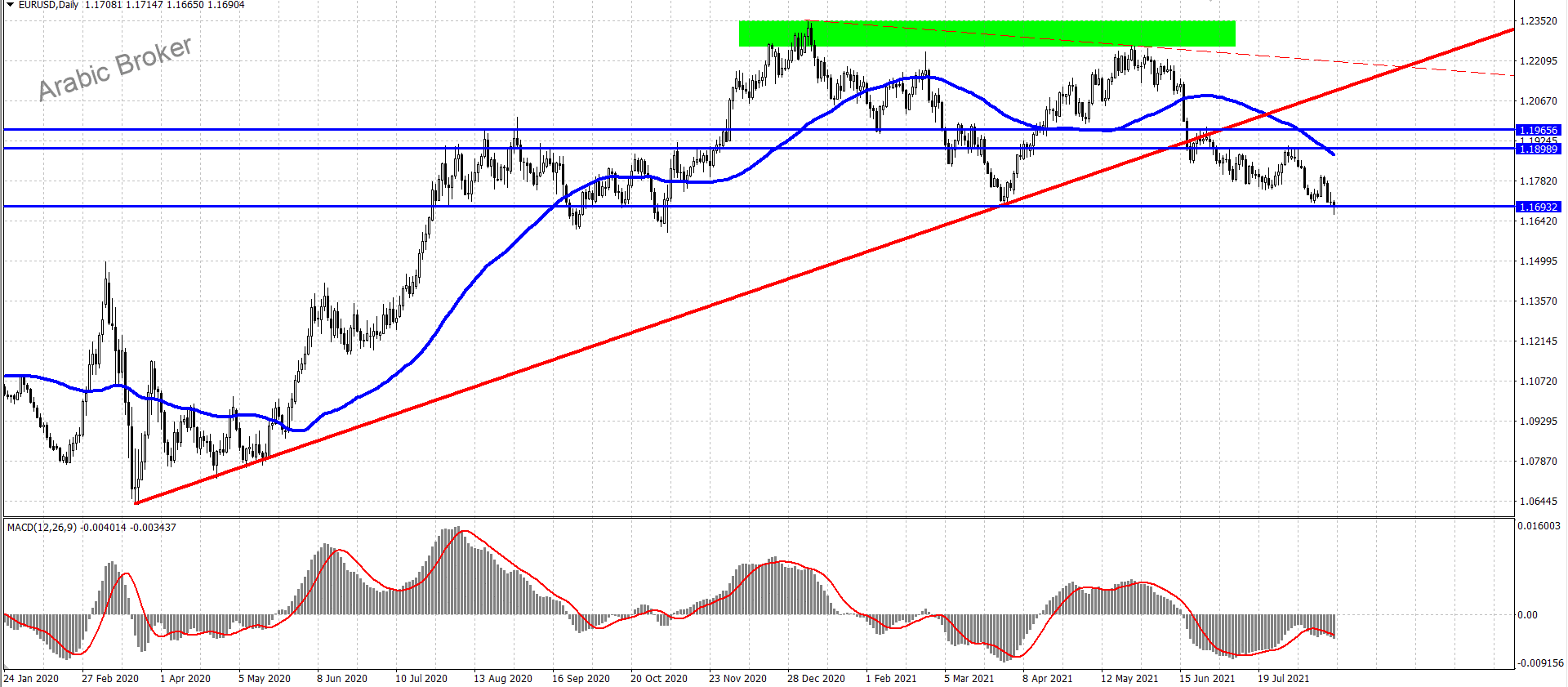اليورو دولار يستمر نحو الهبوط نوهنا مسبقا توقعاتنا لهوبط الزوج ونلاحظ الان استأنف زوج اليورو مقابل الدولار تداولاته السلبية بشكل ملحوظ ليتجاوز مستوى 1.1700 ويؤكد الاندفاع نحو هدفنا السلبي التالي الذي يتواجد عند 1.1605، معززاً التوقعات باستمرار الاتجاه الهابط، والذي يحصل على دعم مستمر من المتوسط المتحرك 50.