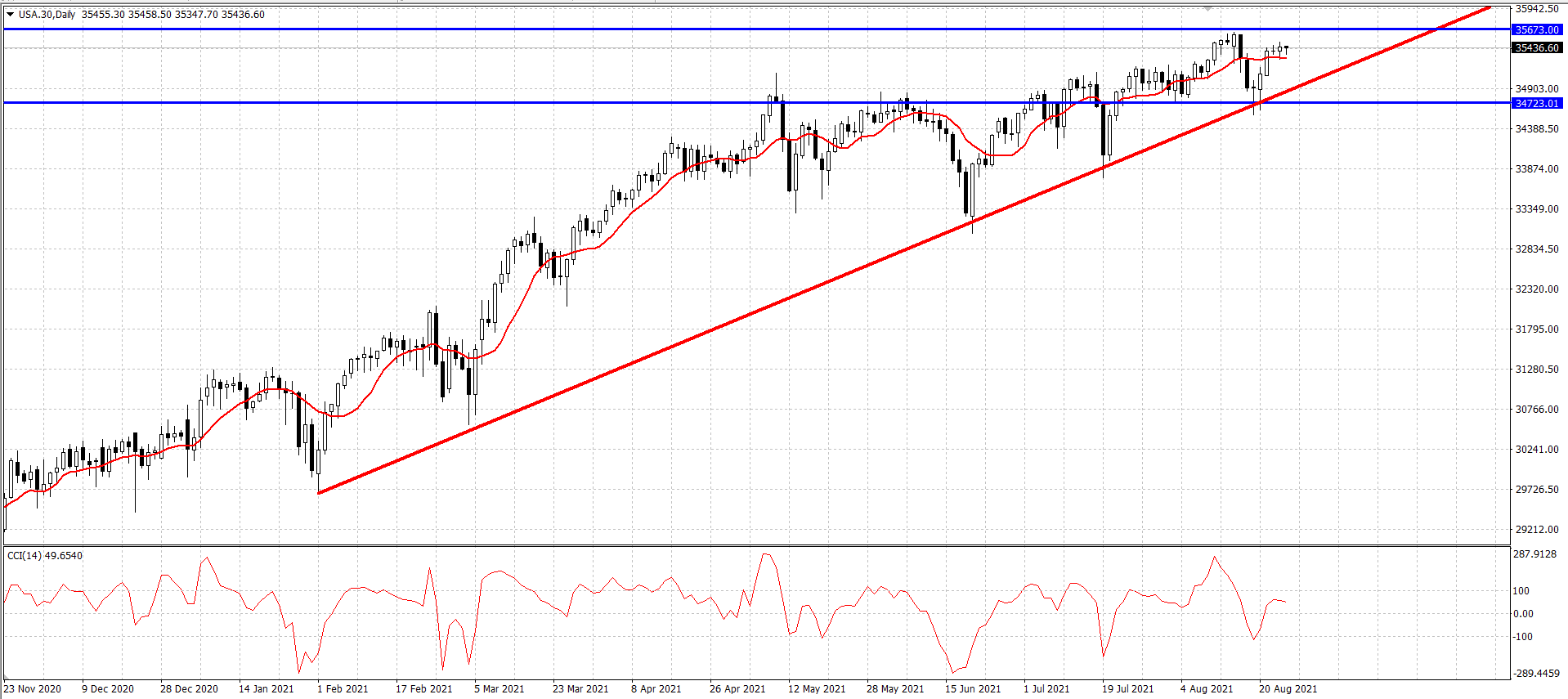 الداوجونز يصمد بشكل ملحوظ الان حتى الان لم يحرك سعر المؤشر أي ساكن حتى هذه اللحظة بالرغم من تمركزه ضمن محاور القناة الصاعدة لملاحظ تذبذبه بشكل جانبي قرب 35350