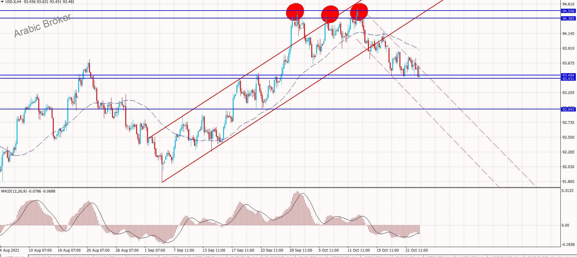 مؤشر الدولار والضغط السلبى من خلال التداولات الوراده الان نلاحظ فشل سعر المؤشر بتجاوز مستوى 93.90 متأثرا بسلبية الماكد المتمركز حاليا قرب مستوى 20 ليجبره ذلك على تجديد الضغط على الدعم الإضافي المستقر عند 93.50,