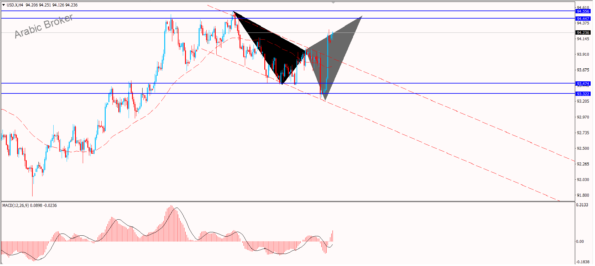 وبالنظر الى العوامل الفنيه نجد انه تم اختراق لمستوى للقناه الهابطه واغلاق اعلاها وتمركز السعر ضمن محاور القناة الصاعدة وباستمرار تقديم المؤشرات الرئيسية للعزم الإيجابي، فإن هذه العوامل تدعم الاستمرارية الإيجابية لنبقى بانتظار مهاجمة السعر للحاجز التالي المتمثل بمستوى 94.55 بهدف إيجاد منفذ لاستئناف الهجوم الصاعد خلال الفترة القادمة.