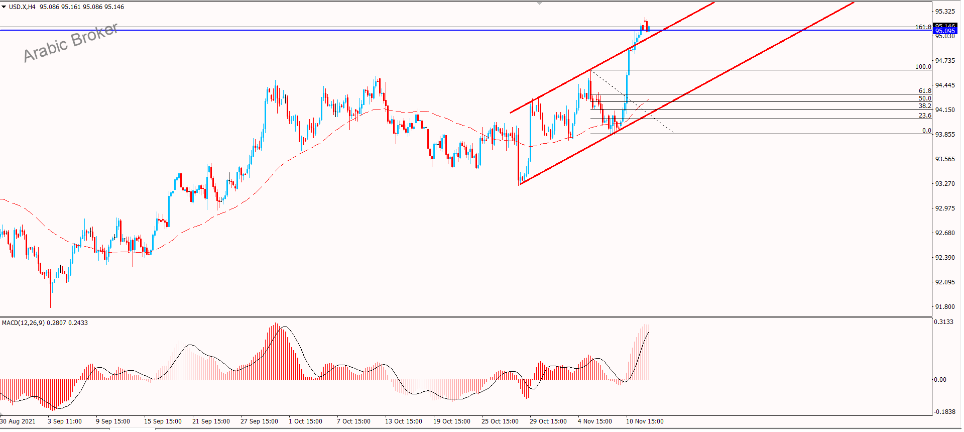 وصول مؤشر الماكد نحو مستوى تشبع الشراء سيمد السعر بعزم إيجابي جديد لنتوقع الوصول قريبا نحو 95.63 وصولا لمقاومة القناة الصاعدة الممتدة نحو 95.90 تقريبا.
