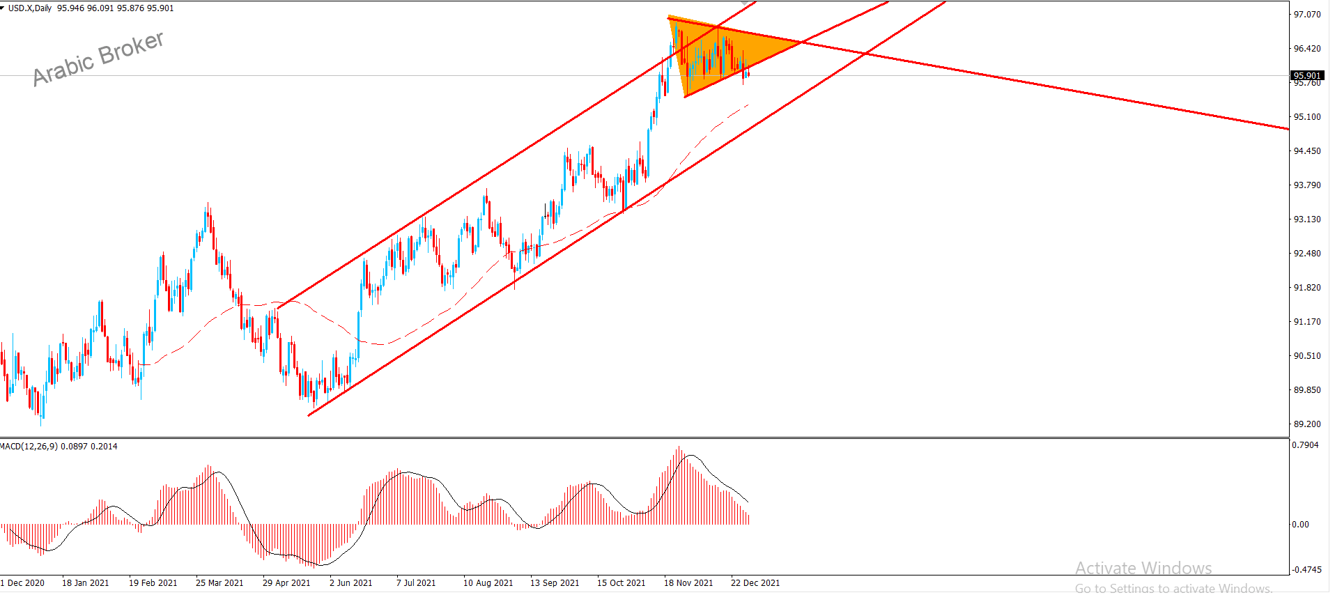 مؤشر الدولار يكسر دعم هام موجه هابطه على شارت اليومى تكونت معنا ليتك كسر نموذج المثلث ومنها استسلم سعر المؤشر للضغوط السلبية المتكررة لنلاحظ تسلله بذلك دون الدعم الإضافي الممتد نحو 96.10