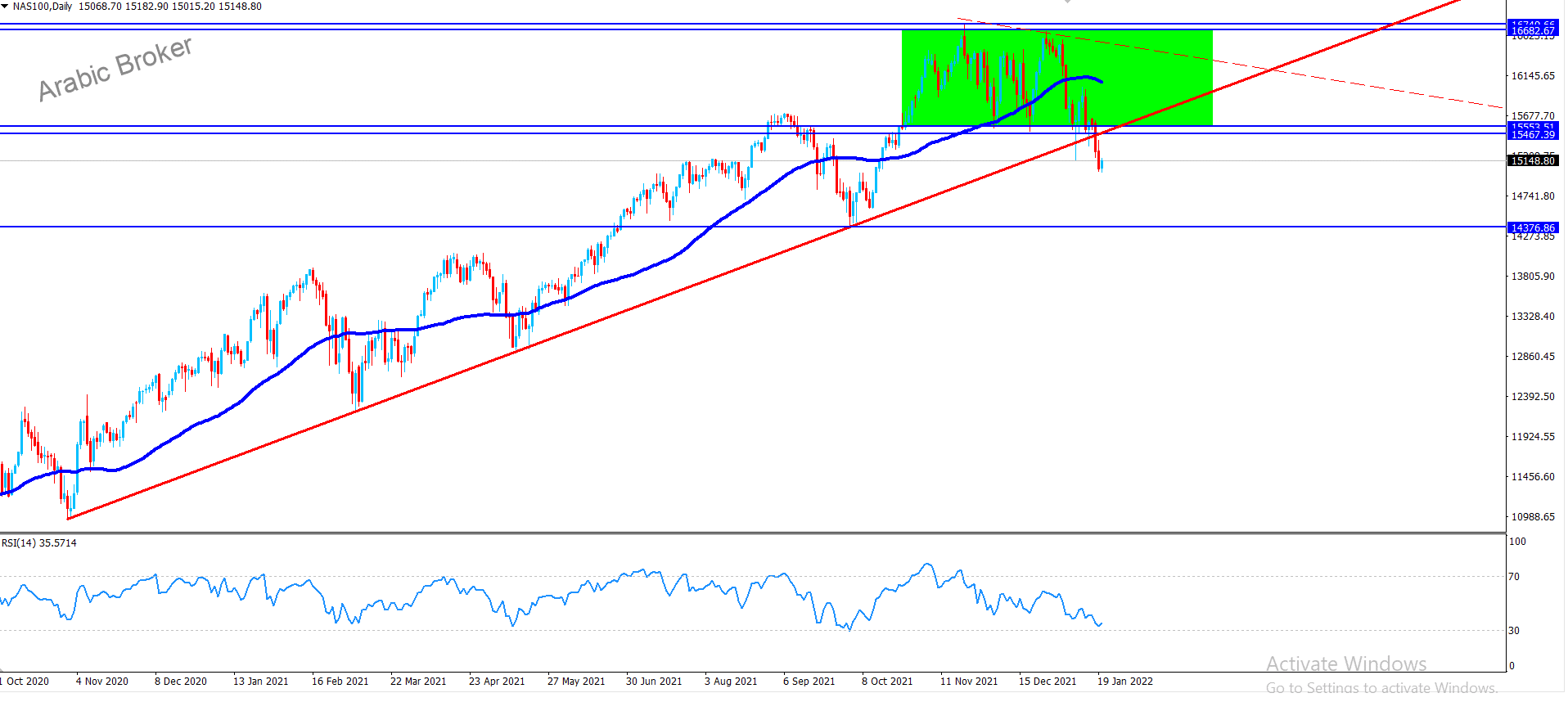 مؤشر ناسداك يكسر ترند صاعد يومى نتج عن الهبوط المتكون على شارت اليومى معنا كسر واغلاق بشكل تاكيدى اسفل الترند الصاعد الان ومنها كرر سعر المؤشر تقديمه لإغلاقات سلبية دون المقاومة الممتدة نحو 15435.00