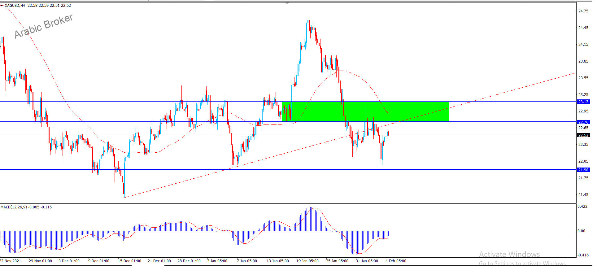 ويظهر من جديد مؤشر الماكد تشبع واضح في الشراء مما يدل على قريبا نجد حركه انعكاسيه ونحن الان بانتظار تحفيز السعر على استئناف التداولات السلبية والتوجه لزيارة مستوى 21.90 مبدئياً