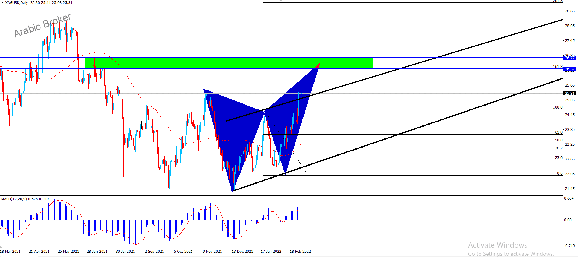 الفضه تخترق القناه الصاعده بمتابعه شارت الاربع ساعات نلاحظ الان تحرك سعر الفضة بتداولاته الإيجابية ليقترب من مستوى 25.50 وكما نوهنا مسبقا فى تقريرنا الاخير