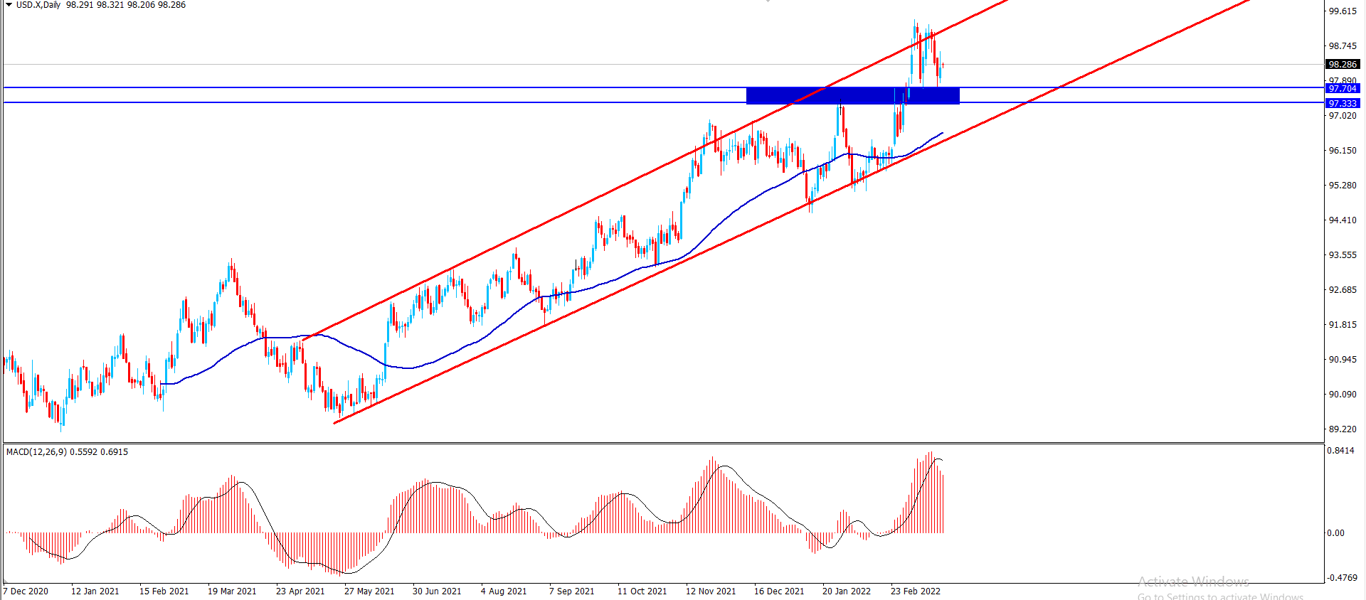 مؤشر الدولار يستمر داخل القناه الصاعده كنا نوهنا الاسبوع الماضى عن استمرار سعر المؤشر مؤخرا بالزحف نحو الصعود الىمن مستوى 97.70 إلا أن استمرار تعارض المؤشرات الرئيسية وبتقديم مؤشر الماكد للعزم السلبي فإن ذلك يزيد من فعالية المسار التصحيحي الهابط والقائم على ثبات الحاجز المستقر عند 99.35.
