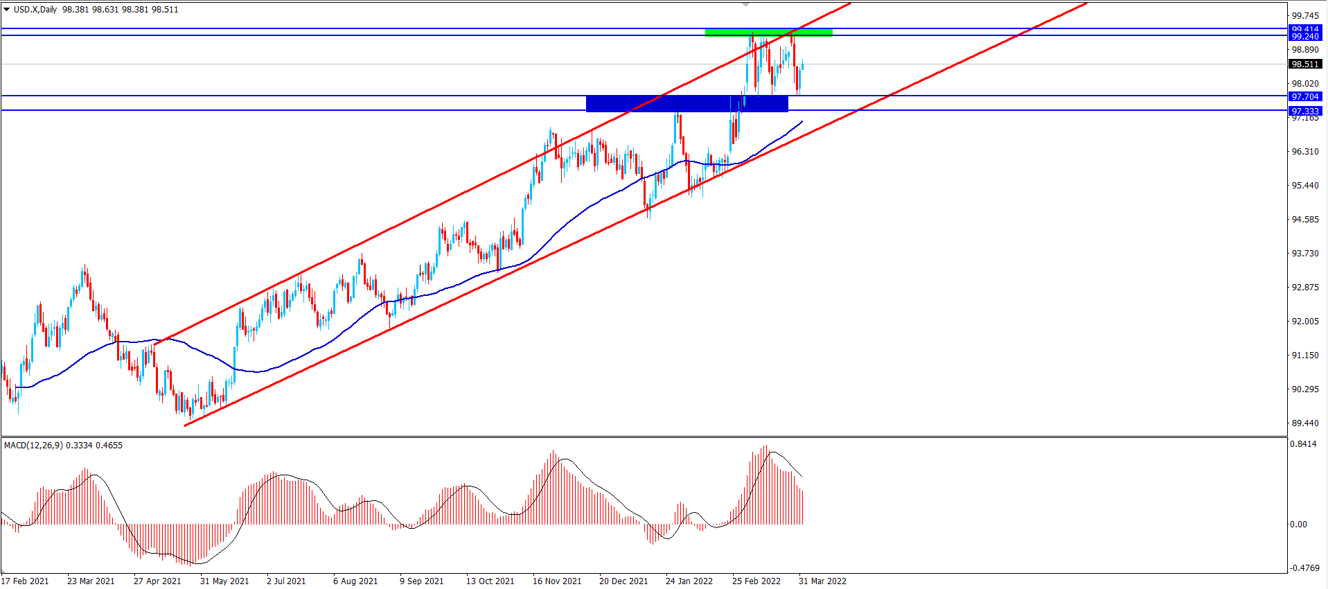 لنلاحظ الان معنا تكون اتجاه عرضى مع بدايه هذا الاسبوع وتعويض خسائره بانجذابه نحو 98.50 كذلك الاستقرار العام ضمن محاور القناة الصاعدة يدعونا للبدء بترجيح المحاولات الإيجابية
