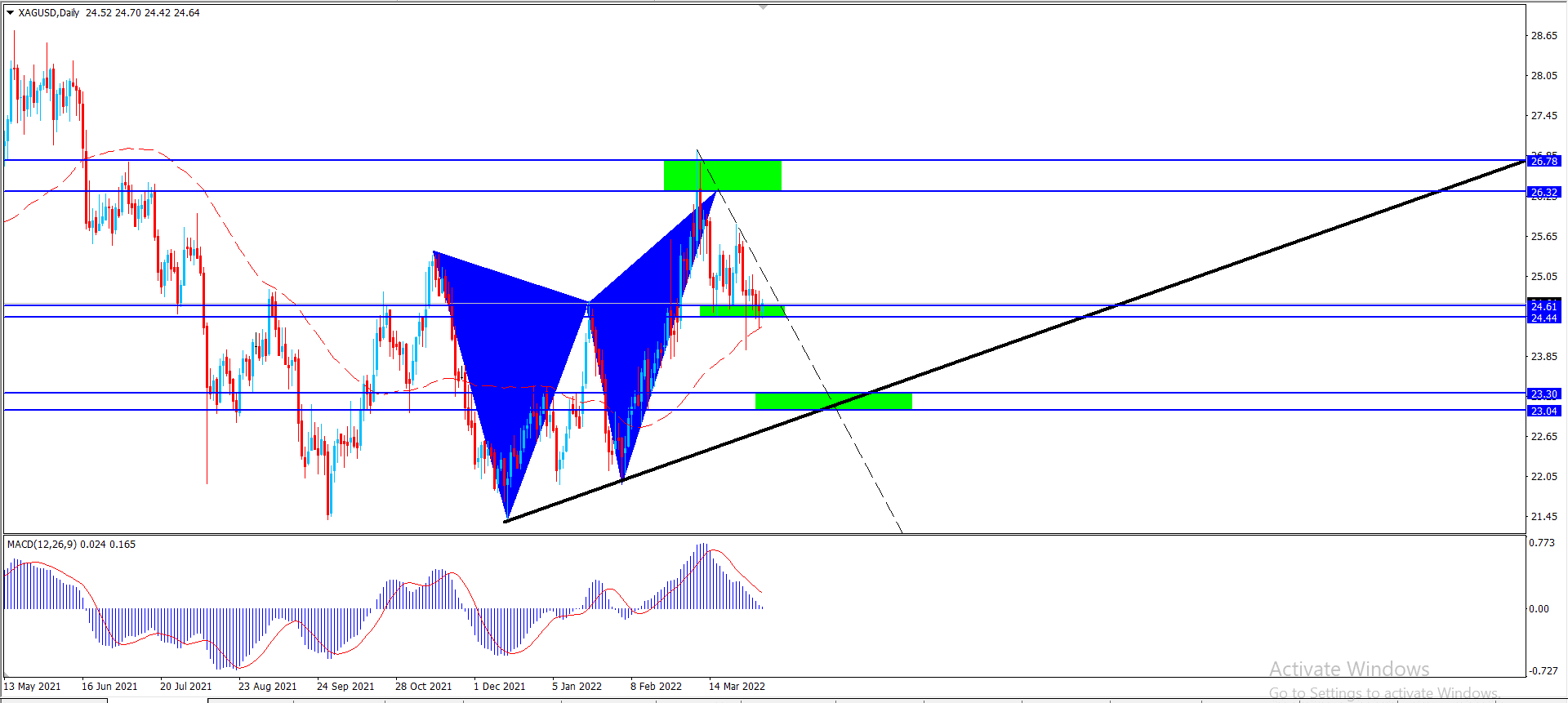 الفضه وصمود الاسعار بمتابعه الشارت المرفق اعلاه الان وصل سعر الفضة الى المستوى المتوقع معنا فى تقريرنا الاخيره عند 24.20 لنجد بأن السعر شكل ترند هابط وتكون قمم وقيعان هابطه بسيطه