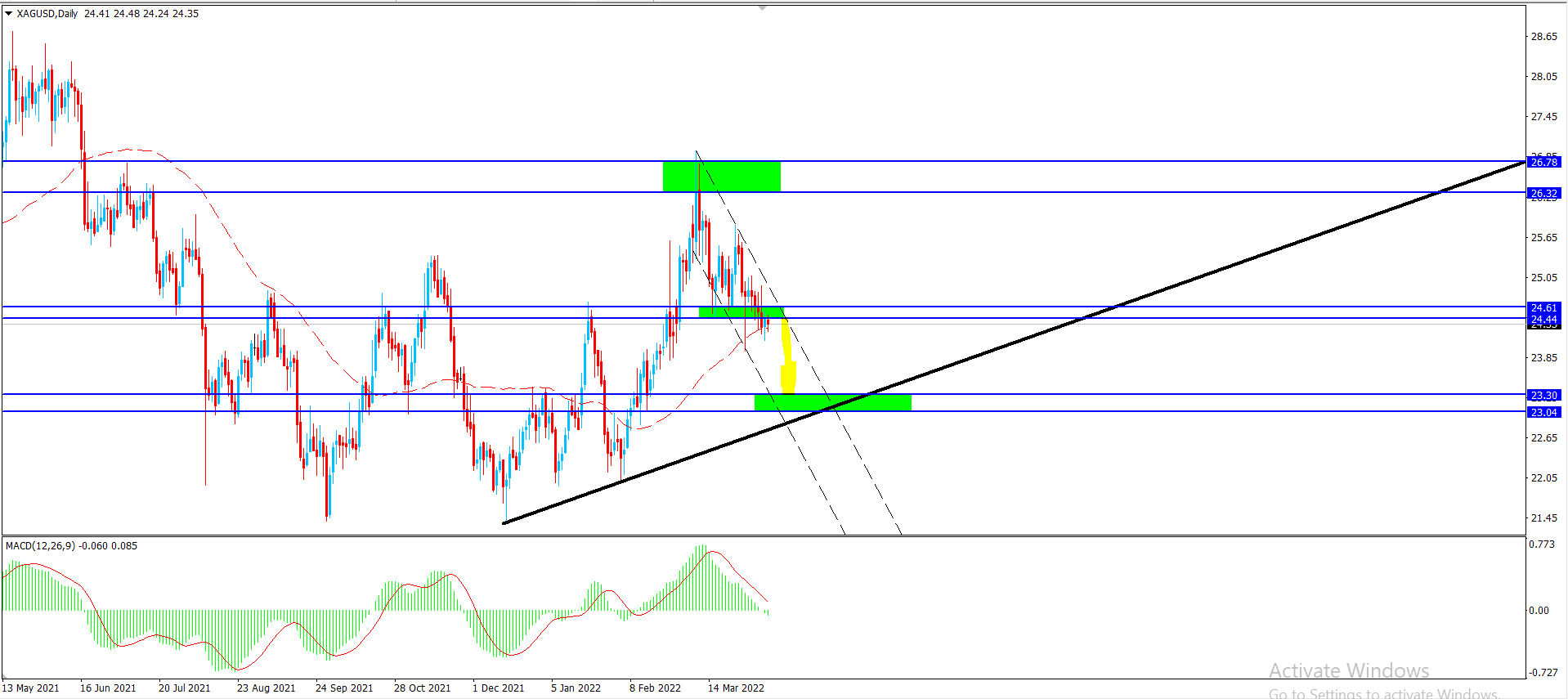 الفضة والسيناريو المتوقع معنا تكون معنا قناه هابطه فرعيه على شارت الاربع ساعات ومنها يواجه معنا الان سعر الفضة دعم قوي عند مستوى 24.20