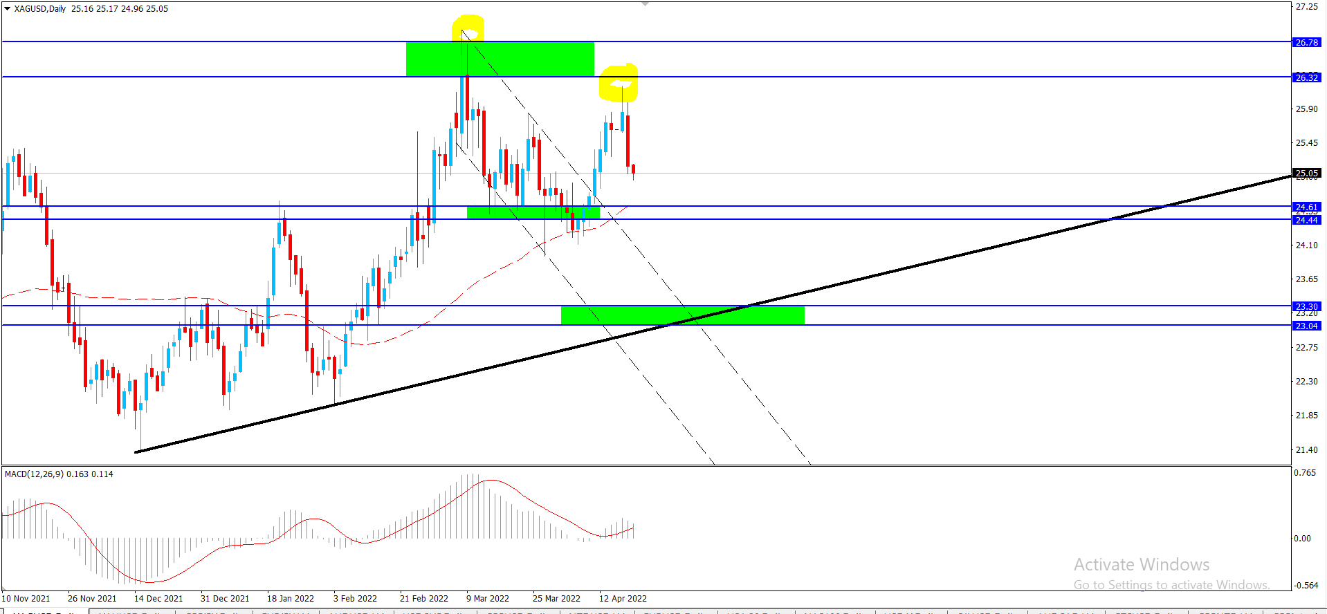 تكونت معنا موجه هابطه قبل تحقق الهدف الايجابى المتوقع معنا على سعر الفضة لنلاحظ ظهور قوه بيعيه و بتحقيق هبوط الى مستوى 25.05 ويضغط سلبا عليه الان،