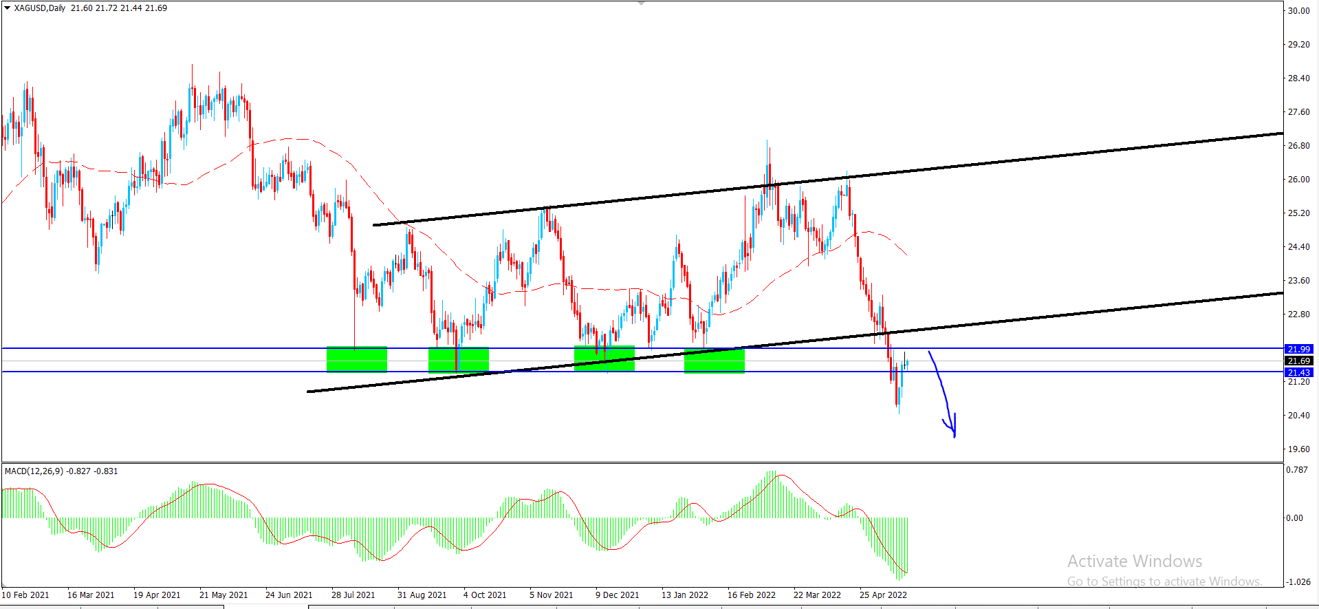 وكما نلاحظ الان كسر القناه الصاعده يدل على هبوط الاسعار و بما أن السعر اسفل مستوى 21.83 فإن توقعاتنا للاتجاه الهابط لا تزال فعالة، بانتظار الحصول على حافز سلبي يساهم بدفع السعر للاندفاع
