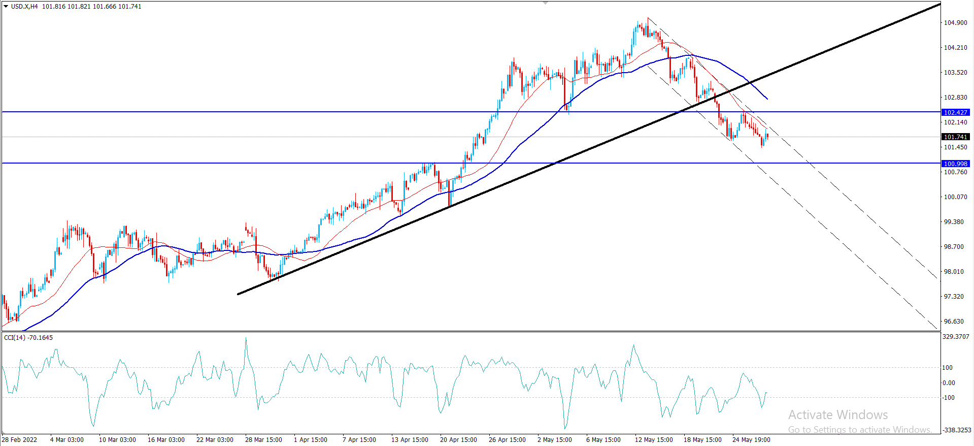 من خلال التداولات الوراده معنا نلاحظ الان عاد سعر المؤشر لتشكيل موجات سلبية جديدة لينجذب بذلك نحو الدعم الرئيسي المتمركز عند 101.45 متأثرا بسلبية مؤشر السى سى اى المتمركز حاليا ضمن مستوى تشبع البيع كما هو واضح بالرسم المرفق.