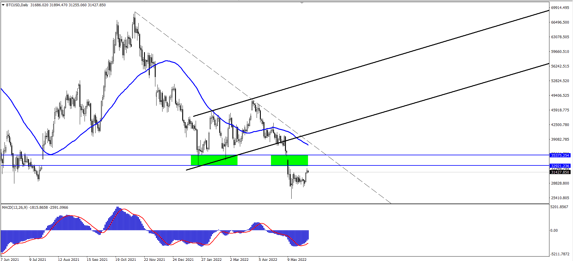 من خلال التداولات الوراده معنا الان على شارت البتكوين كما نلاحظ ظهور قمم وقيعان هابطه نتج عنها موجه بيعيه قويه و كسره لمستوى الدعم اليومى الهام عند مستويات 32920.10 ومنها تكونت موجه هابطه قويه عنيفه