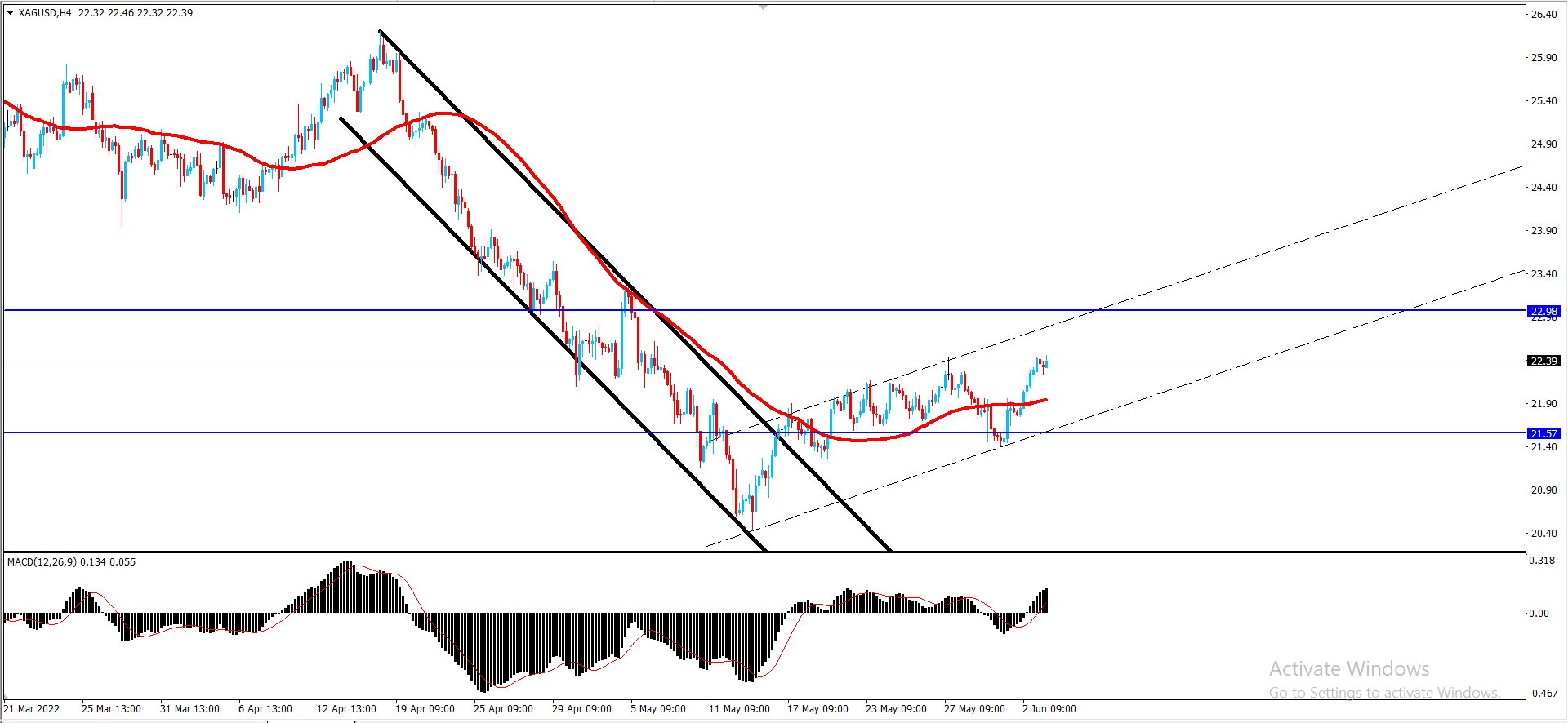 على الشارت المرفق اعلاه الان تم الارتداد من مستوى دعم متحرك للقناه الصاعدهى معنا ونلاحظ الان تستقر تداولات سعر الفضة حول مستوى هام عند سعر  22.40