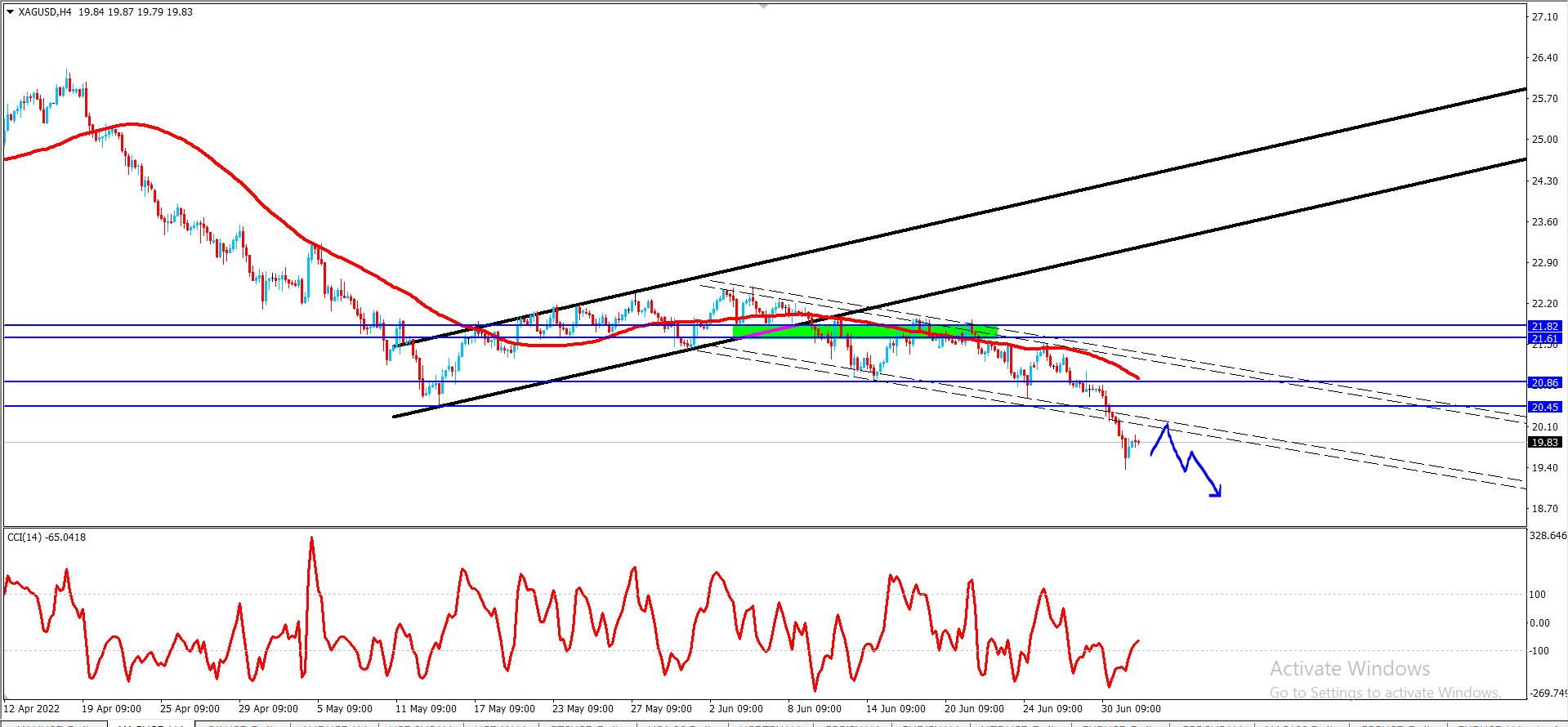 موجه من الهبوط على شارت الفضه تكونت معنا كما نوهنا مسبقا ليصل معنا الان سعر الفضه الى مستوى 19.40 ونلاحظ الان ينخفض سعر الفضة بقوة ليتجاوز مستوى 19.40 مما يوضح توقعاتنا لاستمرار الهبوط الى مستويات ودعوم جديده